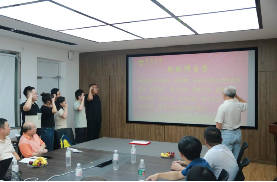 在随后举行的新教师入职仪式上,张吉平老师带领新入职教师进行庄严宣誓,铮铮誓言既是对教师职业的坚定信念,也是对化院人教育精神的一脉相承。大家纷纷表示要自觉肩负起教师的光荣使命,立足教书育人的本职工作,创新传道授业的教育实践,立德树人,为国家的教育事业和公司的发展做出应有的贡献。