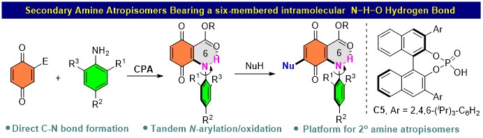 二级胺作为药物活性分子中最常见的官能团之一,其轴手性构筑自2009年发现以来一直是一个挑战,主要由于相对其它轴手性,二级胺轴手性具有更高的旋转自由度,造成其不对称控制非常困难。近日,MK体育官网刘人荣教授课题组通过直接构建C-N键,利用分子内氢键作用力,为二级胺轴手性的不对称合成提供了一条高效策略。该研究工作得到了山东省泰山学者青年专家项目和MK体育官网启动资金的资助。