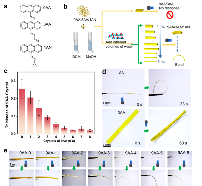 刺激响应晶体作为一类新型智能材料,在诸如光、热、机械力等外界刺激下能够发生显著的理化性质变化。其中,光机械响应晶体具备将光能直接转化为多种机械形变与运动的能力,并在软体机器人、致动器及仿生运动等领域具有重要的潜力应用。然而,该研究领域依然面临调控结晶过程困难、晶体生长尺寸对材料形变影响机制不清晰,以及响应过程如何保持结构完整性等诸多关键科学问题。本研究团工作利用水辅助沉淀法,室温下制备出厚度可控的蒽衍生物晶体,在光照条件下通过[4+4]环加成反应诱发晶体弯曲和分裂的光机械响应行为,赋予了材料连续向光、背光弯曲、撕裂成晶体纤维等特性,并对其运动的幅度、方向和类型进行精确控制,初步探索了光机械响应晶体在模拟类人运动微型机器人方面的应用等。