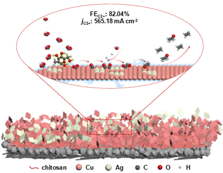 电催化转化CO2制备重要化学品具有碳资源合理利用与环境保护的双重意义,本研究构建了一种具有Cu-Ag双位点的三维GDE(3D-CuAg-GDE),用于电催化CO2还原制备C2+产物。该电极在-0.88 V vs. RHE下实现了82.04%的C2+法拉第效率,部分电流密度达到565.18 mA cm-2,且在500-900 mA cm-2的宽电流范围内仍能保持近60%的C2+选择性。实验与理论分析表明,壳聚糖诱导生长的三维结构提高了活性位点利用率和CO2传质效率,其与CO2分子间形成的氢键促进了CO2的富集与吸附。密度泛函理论(DFT)计算表明,*CO中间体能够从Cu位点迁移至Ag位点,有效降低*CO加氢活化能,促进Cu吸附的*CO与Ag结合的*CHO物种之间发生耦合反应。这项工作阐明了双位点协同作用对C2+产物生成的影响,并为设计高效GDE以实现安培级CO2电解提供了新的见解。