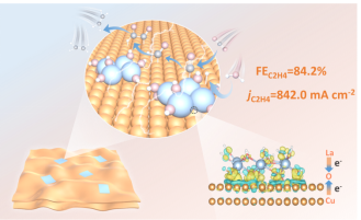 利用可再生电力驱动CO2催化还原为C2H4,为生产高附加值化学品提供了一条环境友好的路径。本研究构建了一种具有内置电场的La(OH)3-Cu电催化剂(BEF@La(OH)3-Cu),实现了CO2向C2H4的高选择性转化,其法拉第效率高达84.2%,分电流密度达到842.0 mA cm-2,并保持110小时的稳定运行。此外,相应的C2H4生成速率和能量效率分别达到2618.0 μmol cm-2 h-1和31.2%。基于多种原位表征与密度泛函理论计算的综合分析表明,该催化剂通过堆叠La(OH)3与Cu层形成La→O←Cu电子转移诱导的内置电场,有效触发La(OH)3-Cu界面水分子解离以持续供给活性氢(*H),进而推动CO2至C2H4转化过程中的多步质子化反应。*H迁移至Cu活性位点,显著降低*CO转化为*COH的能垒,促进高效*CO−*COH耦合,最终在安培级电流密度下实现了C2H4产率的显著提升。这项工作阐明了内置电场策略在推进CO2还原反应中的广阔前景,并为其它电催化体系中催化剂设计提供了借鉴。