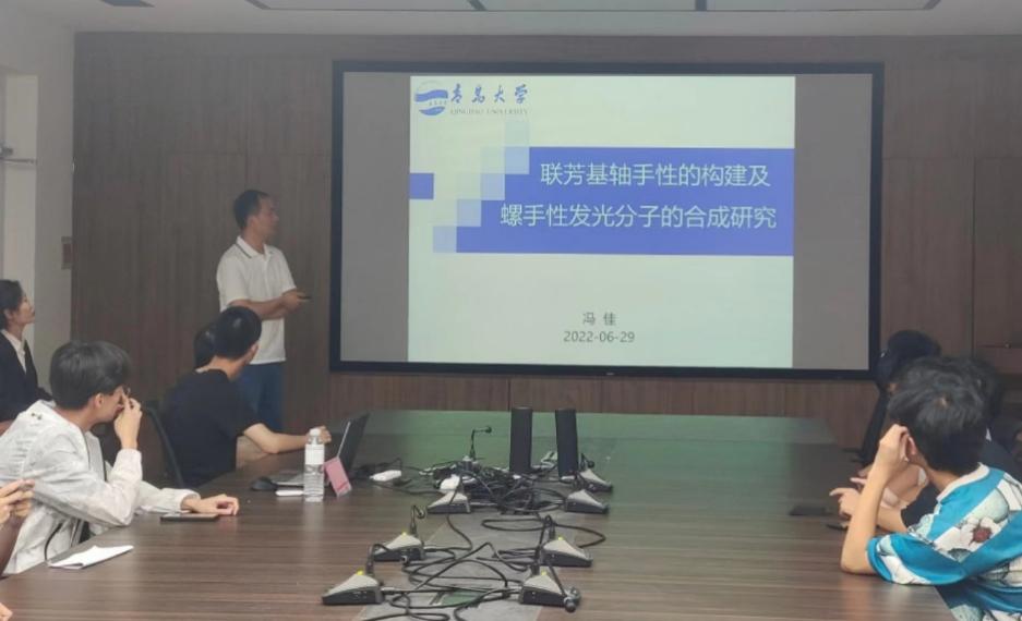 冯佳老师从我们日常生活中无处不在的手性出发,结合自己的研究方向为我们介绍了联芳基轴手性的构建及螺手性发光分子的合成研究,轴手性是由于手性轴旋转受阻而产生的一种手性表现形式,广泛存在于天然产物、药物分子及有机功能材料中。冯佳老师以一种更加通俗易懂的方式使参会同学对联芳基轴手性的构建及螺手性发光分子的合成研究有了一个更加深入的了解。