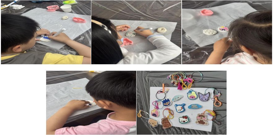 游戏环节结束后,孩子们取回已经固化的粘土胚体,进入了充满艺术气息的涂色阶段。孩子们化身小小艺术家,精心挑选心仪的色彩,用画笔为作品赋予鲜活的生命力。星星、花朵、小动物、卡通人物……在孩子们天马行空的想象力和细致的描绘下,一件件独一无二、色彩斑斓的艺术品跃然眼前。在老师和志愿者们的帮助下,这些精美的作品被安装上钥匙扣环或磁铁,华丽变身为实用的钥匙扣和可爱的冰箱贴,成为孩子们在这个特别节日里最珍贵的纪念品和劳动成果。